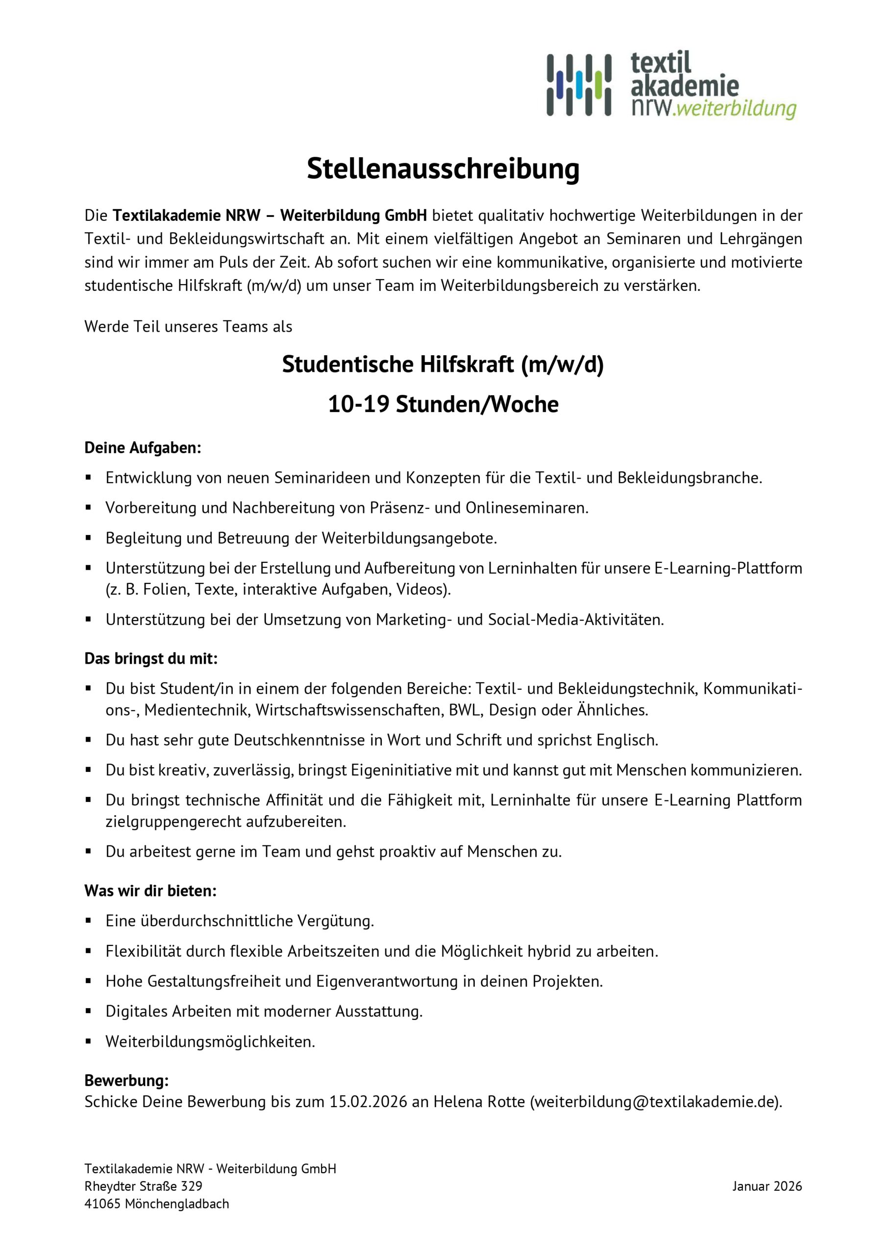 Schicke Deine Bewerbung bis zum 15.02.2026 an Helena Rotte (weiterbildung@textilakademie.de).