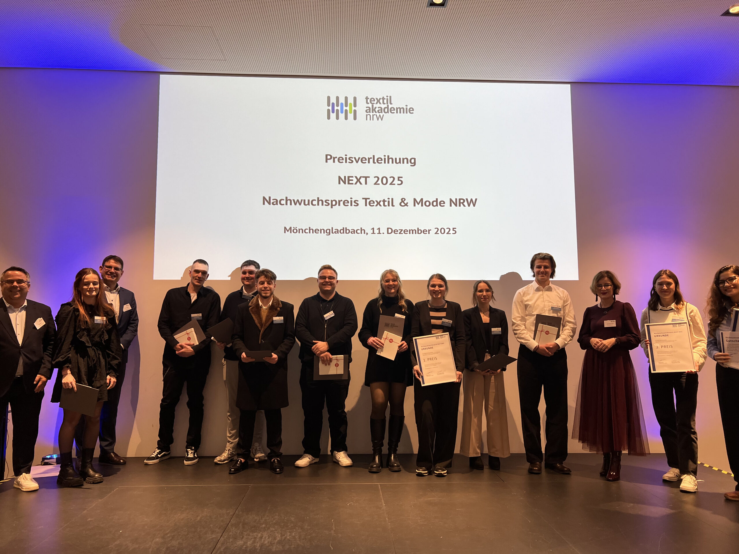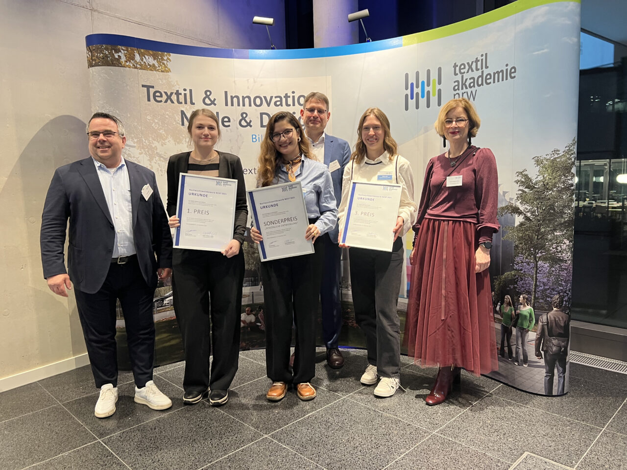 Im festlichen Rahmen der Textilakademie NRW wurden heute die Preisträger/-innen des Nachwuchspreises NEXT 2025 geehrt. Mit der jährlichen Preisverleihung würdigen wir herausragende Leistungen junger Nachwuchstalente aus der Textil- und Modebranche. Der diesjährige Abend war erneut geprägt von beeindruckendem Engagement, Kreativität und Innovationsgeist – und erfüllte uns mit großem Stolz.