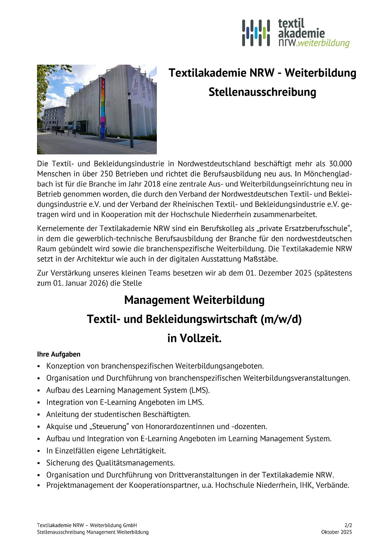 Zur Verstärkung unseres kleinen Teams besetzen wir ab dem 01. Dezember 2025 (spätestens zum 01. Januar 2026) die Stelle Management Weiterbildung Textil- und Bekleidungswirtschaft (m/w/d) in Vollzeit.