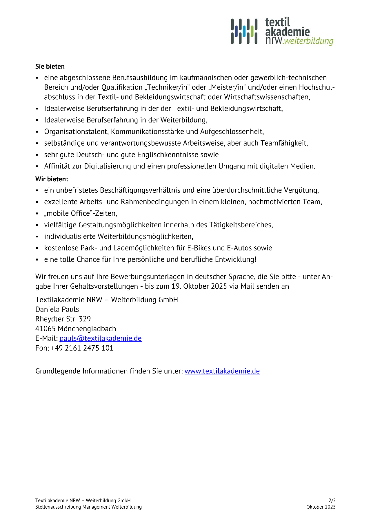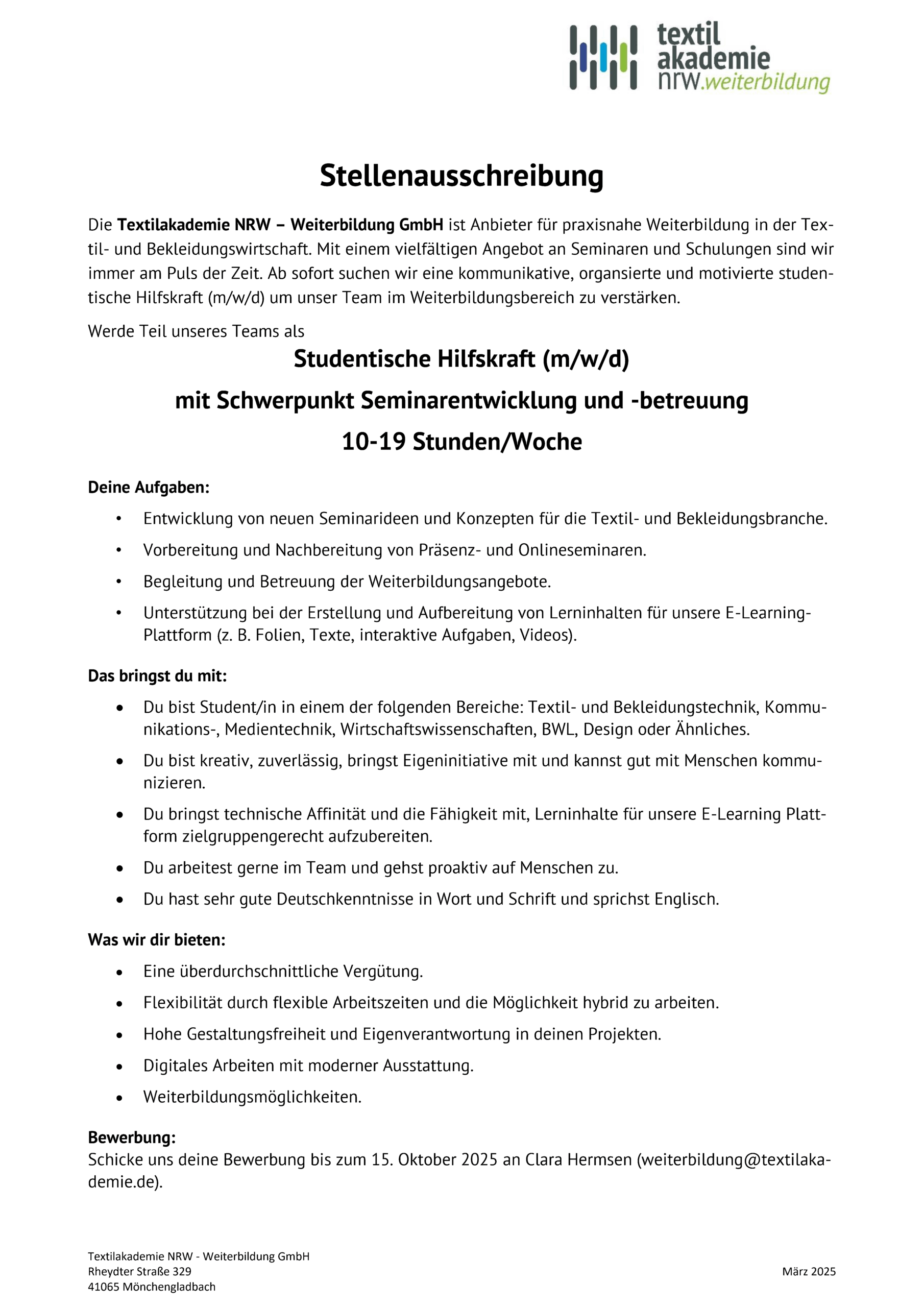Eine Bewerbung ist bis zum 15. Oktober 2025 an Clara Hermsen (weiterbildung@textilakademie.de) möglich.
